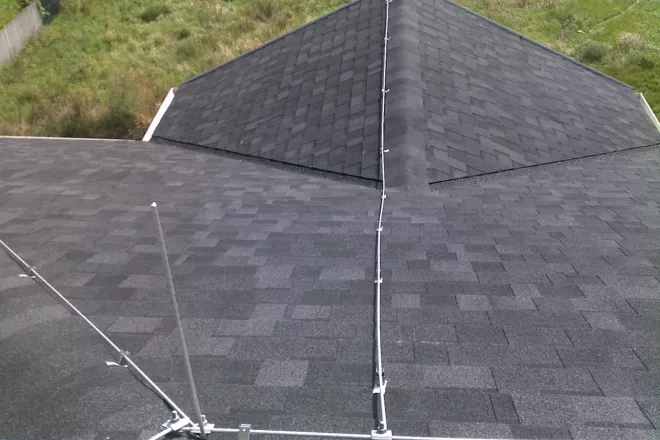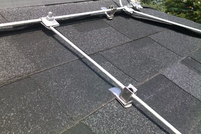 Sistema parafulmine installato su un tetto in tegole canadesi IKO mod. Cambridge Xpress 52